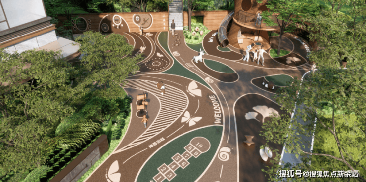 社区还打造了“森林精灵”主题的儿童乐园,充满沉浸感,分区满足各年龄段孩童玩乐和父母的亲子陪伴需求。通过色彩描绘健身图案的健身乐活场,加入乒乓球桌、球网等可移动健身设施,以及全区多个登高健身花园,满足全龄段的业主健身需求。