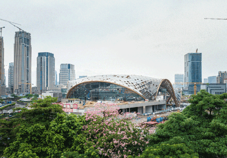 外立面采用木色陶板与全景玻璃幕墙,以“曲水流觞”的涟漪造型呼应珠江文脉。