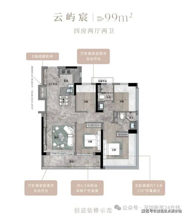99㎡的4房2厅2卫,设计的是竖厅格局,客厅3.35米开间,LDKB一体化,S墙设计预留双开门冰箱卡槽位,三开间朝南,动静分区,U型厨房,公卫三段式干湿分离,赠送设备平台,得房率约78.27%(不含赠送),客厅连接次卧出9.37m²大阳台西南或东南朝向。靓点:99平做到了4房2卫,主卧270°无柱转角飘窗,厨房烟道外置+额外赠送设备平台,并且是纯南向格局。