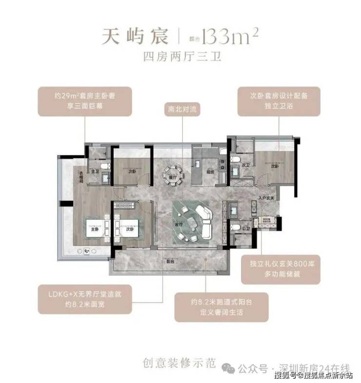 133㎡的4房2厅2卫,设计的是竖厅南北通透格局,进门入户玄关,客厅5.4米开间,餐客厅分离设计,客厅连接次卧出12.3m²的观景大阳台,L型中式+岛台灵动式厨房,公卫三段式干湿分离,得房率约78.27%(不含赠送),阳台主朝东南或西南向。靓点:超大客餐厅南北对流+8.2米长超大观景南向阳台,超大主卧+270°无柱转角飘窗