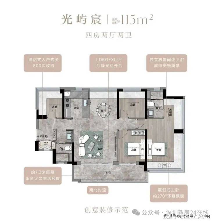 115㎡的4房2厅2卫,设计的是竖厅南北通透格局,进门入户玄关,客厅4.45米开间,餐客厅分离设计,客厅连接次卧出10.87m²的观景大阳台,L型中式+岛台灵动式厨房,公卫三段式干湿分离,得房率约78.27%(不含赠送),阳台主朝东南或西南向。靓点:南北对流+7.25米长超大观景南向阳台,超大主卧+270°无柱转角飘窗