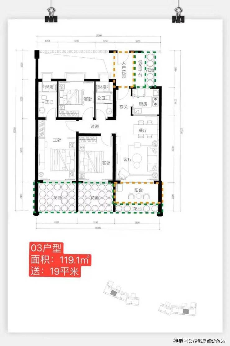 3号房,3房2卫:约119平送19平(总价736-908万)