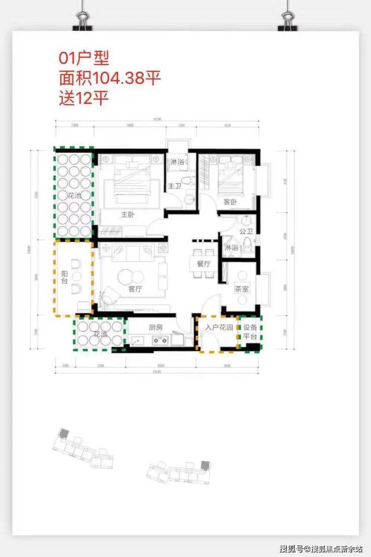 1号房,3房2卫:约104平送12平(总价403-467万)