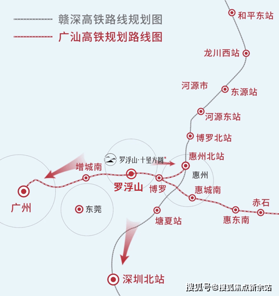 罗浮山·十里方圆,直线距离罗浮山高铁站约550米,未来将有广汕高铁、赣深高铁、厦深高铁、深汕高铁、广河高铁共5条高铁交汇于此。