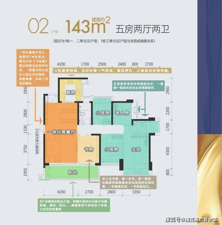 建面约143平户型,为市面少见的5房设计,户型方正、全明通透、4开间朝南,入户带宽阔玄关、客厅开间高达约4.2米、阳台面宽高达约6.9米,书房可与客餐厅打通、变成媲美大平层豪宅尺度的超大公区,是一步到位、终极改善的优选。