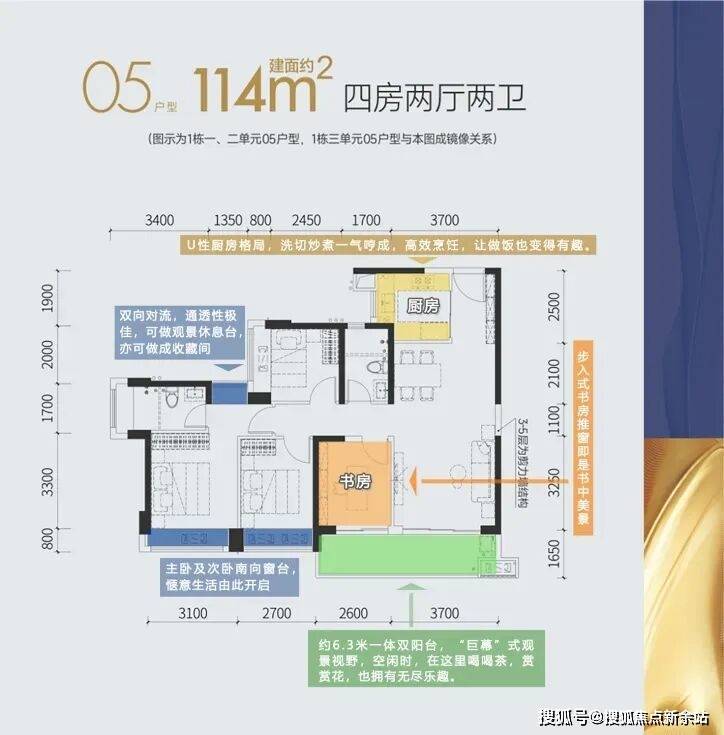 建面约114平4房2厅2卫,项目的王牌户型,户型方正、动静分离、4开间(3间卧室+客厅)朝南、南向面宽高达约12.1米,阳台可俯瞰茅洲河。