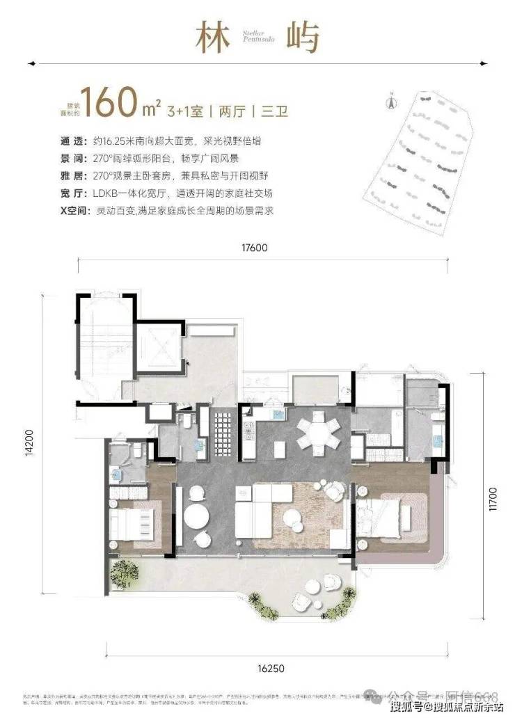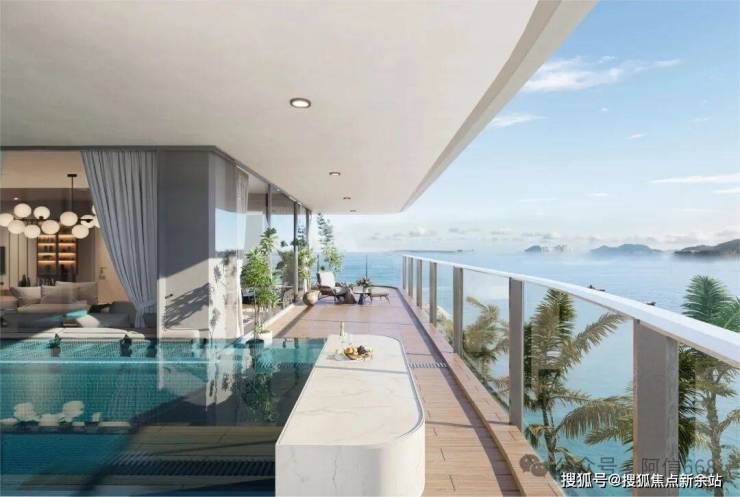 超流体建筑立面呼应海浪肌理,底层架空、悬挑阳台消解建筑与水岸的边界,270°观景阳台、环形瞰海露台设计,让河景、海景与生活空间深度交融,实现“收藏半条海棠河的晨昏”的沉浸式体验。