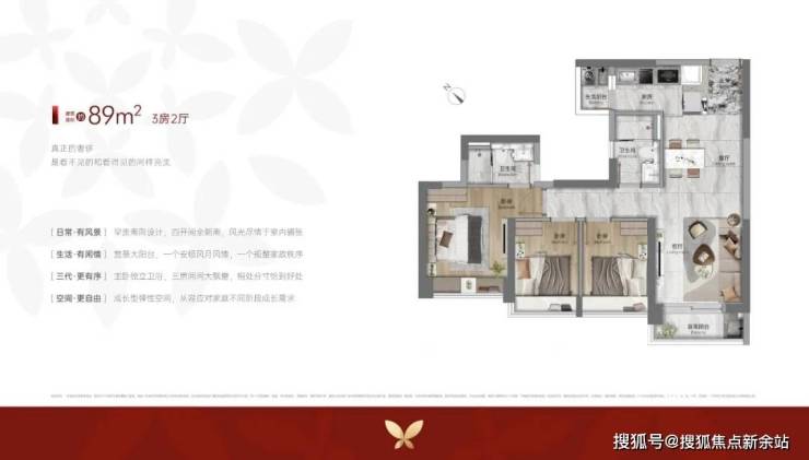 89平3房2卫,这是整个盘最热销的户型。每间房都方正,面积也均衡。小缺点是过道有点浪费空间。