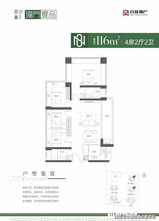 116㎡的4房2厅2卫,设计的是横厅南北通透格局,进门入户玄关,客餐厅6米开间,LDKB一体化设计,五开间朝南,4个卧室分别做到了3.775米/3.2米/2.6米/2.575米的宽度,主卧三面飘窗,6米长的大阳台,L型厨房,卫生间干湿分离,得房率:70.65%(不含赠送),阳台主朝东南向。