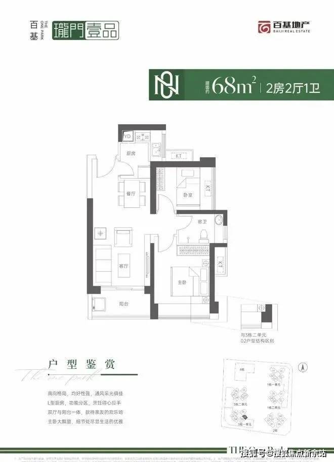 68㎡的2房2厅1卫,仅3栋1单元02户型,设计的是竖厅格局,客厅3.2米开间,LDKB一体化设计,L型厨房,卫生间干湿分离,得房率:71.3%(不含赠送),东南朝向。