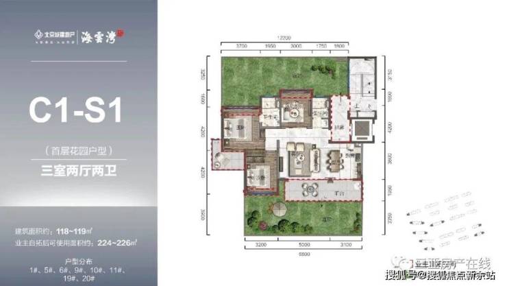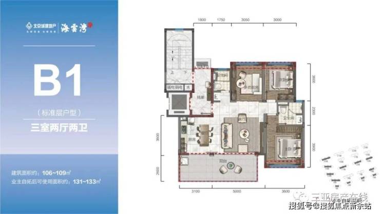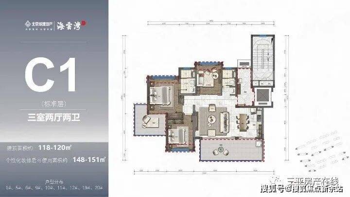 标准洋房产品(B1、C1):主力107-120㎡超大横厅宽境墅质洋房 三室两厅奢适尺度阔景阳台,纵览一线海岸