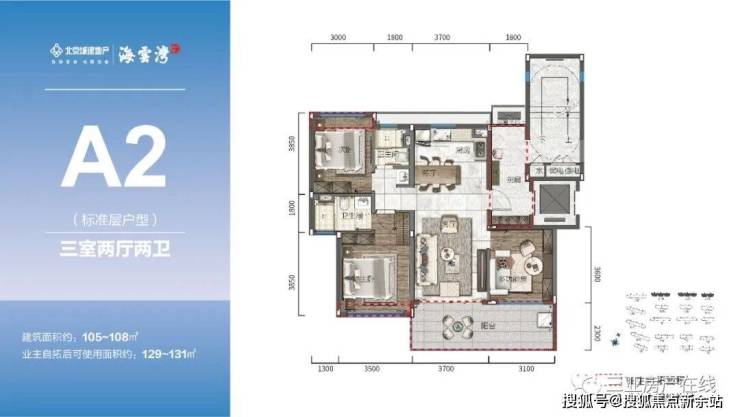 标准洋房产品(A1、A2):105-117㎡演绎大面宽短进深的经典格局 三室两厅悦享方正宜居,品鉴自贸港粹美生活