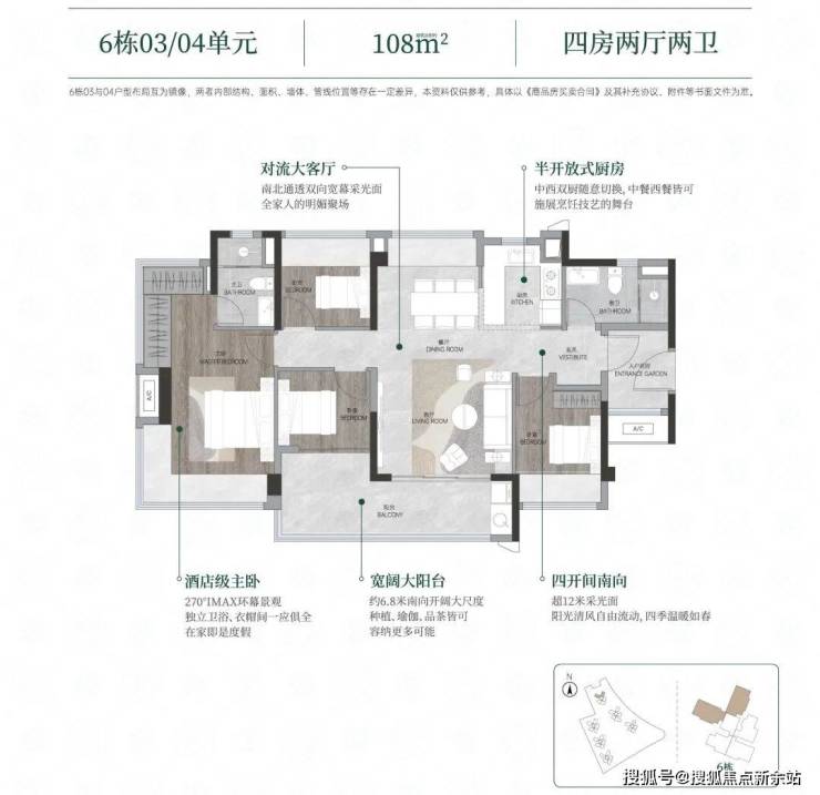 整个社区围合式布局,采用风车形楼型,取消北向户型,全南向排布,同等面积,朝向更佳;基本实现四开间以上,保证两个以上卧室南向,比同等南向产品品质感更强。
