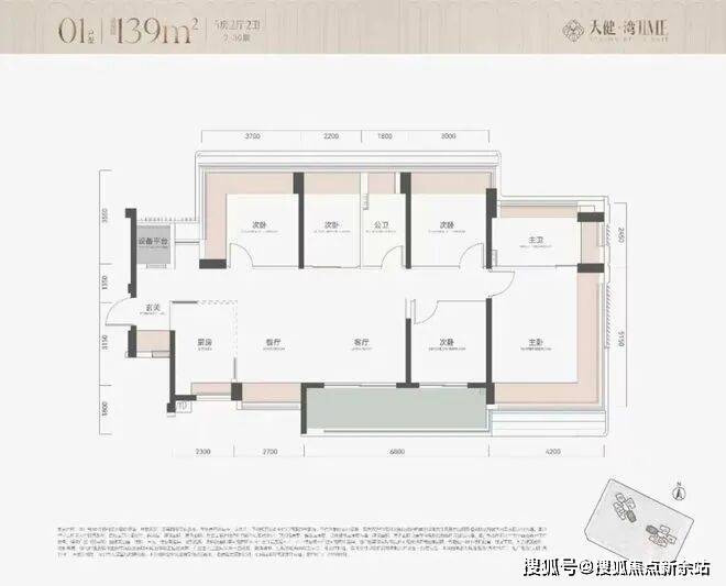 最后是01的139平5房2卫户型,可以看成是放大版的04,也在边户,比较通透的横厅设计,朝南看海,主卧尺度比较大,洗手间带双台盆和浴缸以及步入式衣帽间: