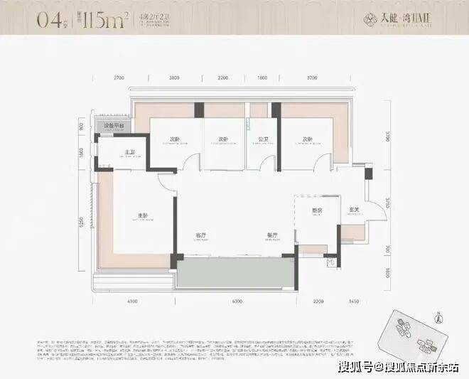 下面的04户型是常见的横厅户型,115平4房2卫,边户,很通透,朝南,特点是主卧和两个次卧都能实现双面飘窗采光,得房率高,且非常合理地设置了入户玄关,避免了多数横厅户型存在的大门正对主卧门的缺点。另外,客餐厅同时出大阳台,整个公区显得非常宽敞舒适。