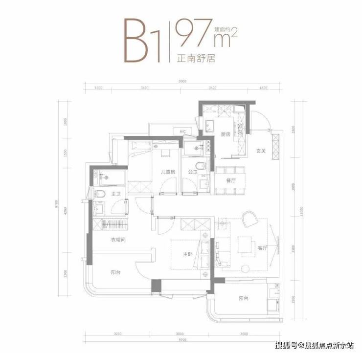 97㎡的3房2厅2卫,设计的竖厅格局,客厅3.5米开间,客餐厅一体化,三开间朝南,3个卧室分别是3.2米/3米/2.6米的宽度,U型厨房,得房率:76.55%(不含赠送),朝南向看花园。