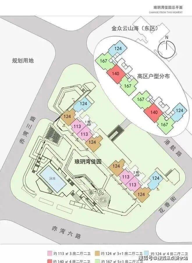 地址位于南山区招商街道赤湾三路与赤湾六路交汇处。金众云山海公馆东区南面,赤湾总部大厦西面。总占地约1.1万m²,总建面约7.5万㎡,容积率4.50,绿化率40%,规划2栋纯住宅,1栋和2栋,总高45层,总户数380户,无保障房、回迁房,纯住宅社区。其中31层卫避难层,2-30层梯户比5梯5户,31-45层4梯4户,一梯一户设计配比,规划停车位330个,车位比1:0.87,预计2025年10月份精装交楼