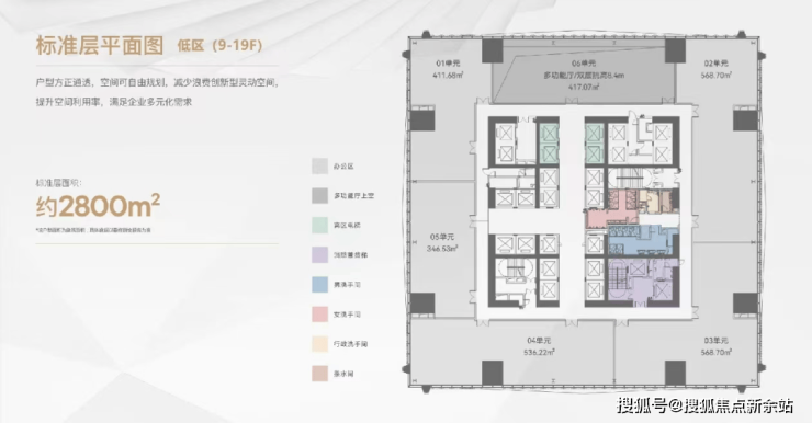 大堂层高:双大堂设计,1F约11.4米/5F约9.6米
