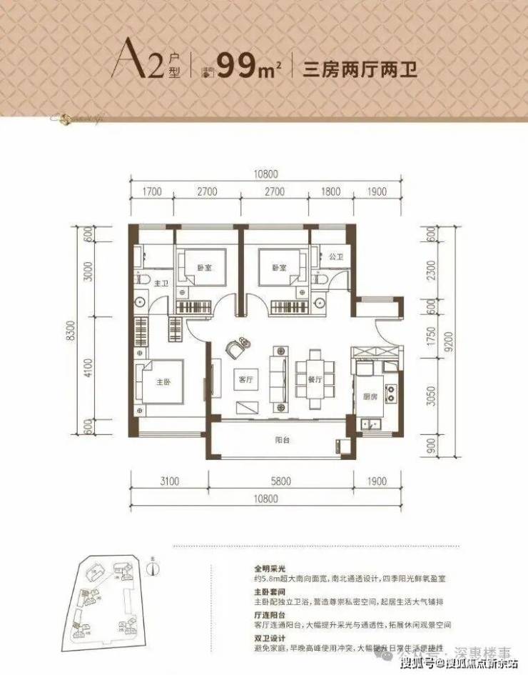 99㎡的3房2厅2卫,A2户型,设计的是横厅南北通透格局,客餐厅5.8米开间,LDKB一体化设计,四开间朝南,分别做到了主卧14.57㎡/次卧9.72㎡/次卧9.72㎡(包含墙体飘窗),U型厨房,公卫三段式干湿分离,得房率约93%(包含赠送),阳台长5.8米约8.7平西南朝向。