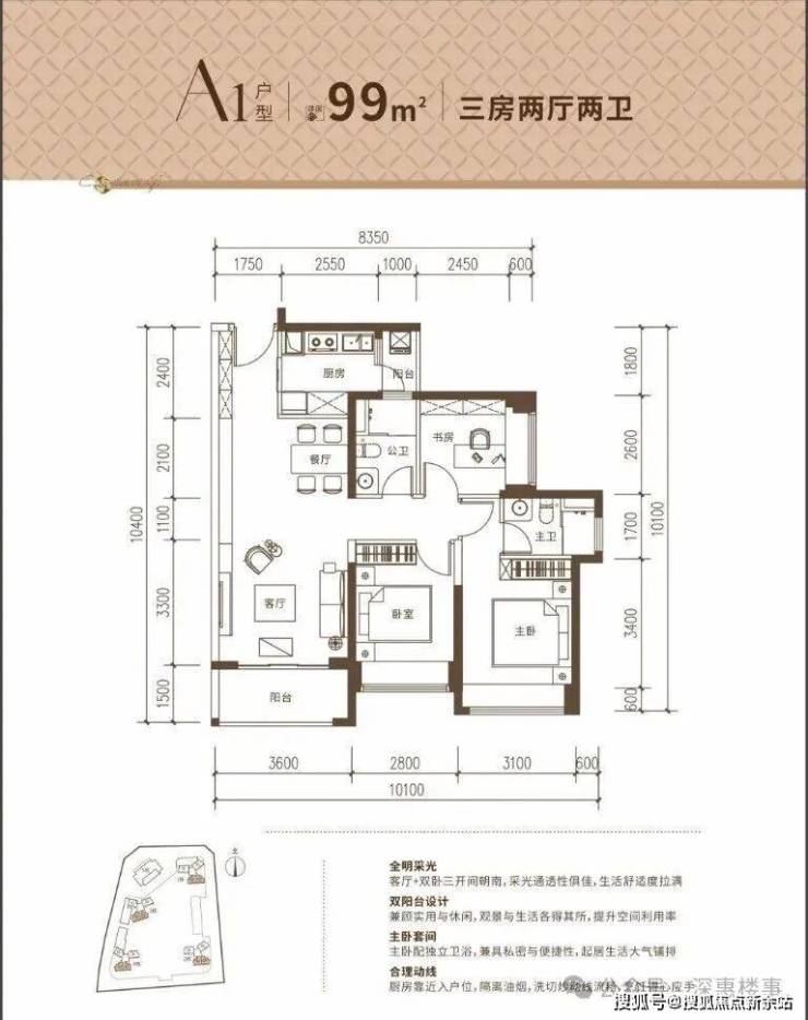 99㎡的3房2厅2卫,A1户型,设计的是经典竖厅格局,客厅3.6米开间,LDKB一体化设计,动静分区,客厅+主卧三开间朝南,分别做到了主卧14.1㎡/次卧10.92㎡/次卧7.93㎡(包含墙体飘窗),二字型厨房带1个生活阳台,卫生间干湿分离,得房率约88%(包含赠送),阳台约5.4平正南或东南朝向。