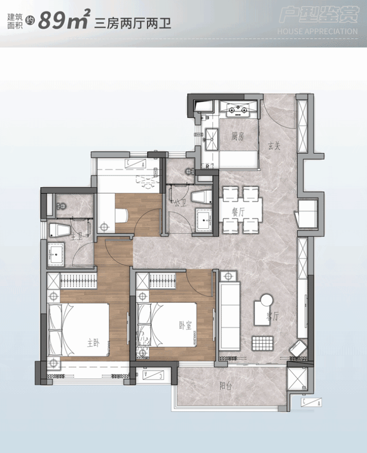 先来看建面约89㎡,这是一个市面上极为常见的面积段,也是竞争最激烈的面积段。