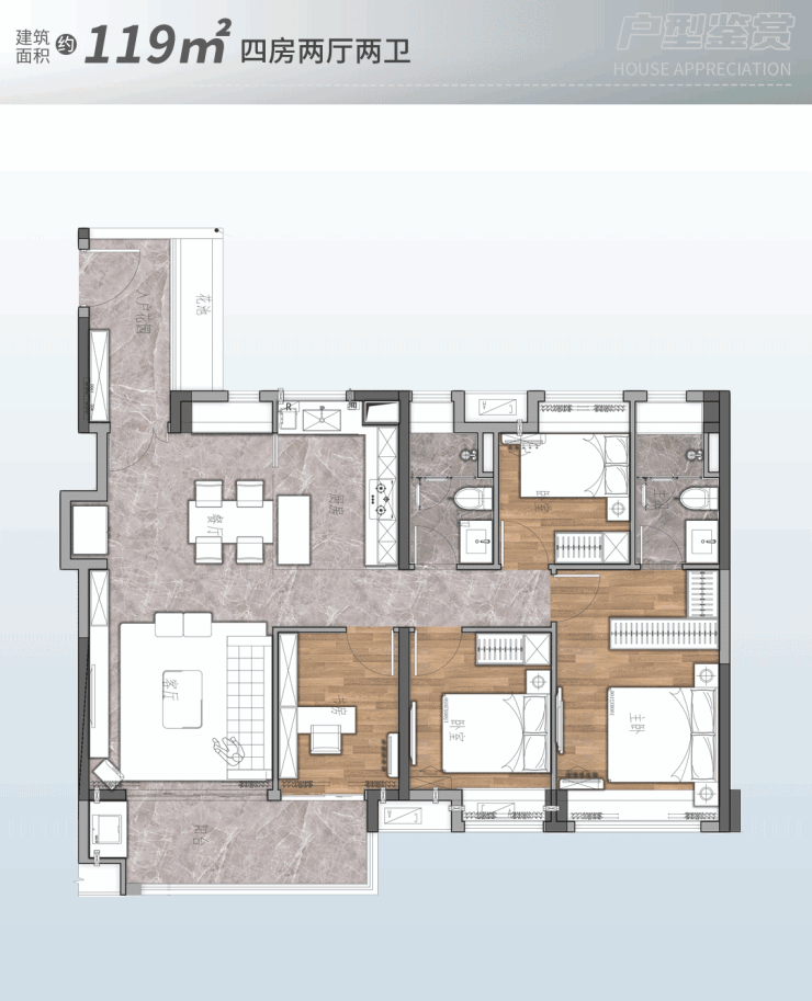 关键是,市面建面100㎡以三房为主,这个项目却施展出四房两卫的绝妙设计,多一间房,多的不止是空间,更是生活的从容与享受。