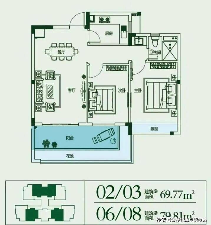 建面约70~80㎡,2房2厅1厨1卫