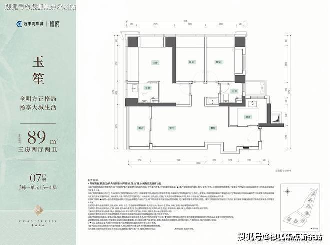 89㎡3房2厅2卫,西南朝向,竖厅布局,卧室做了大面积凸窗赠送,同时主卧也算带独立衣帽间。