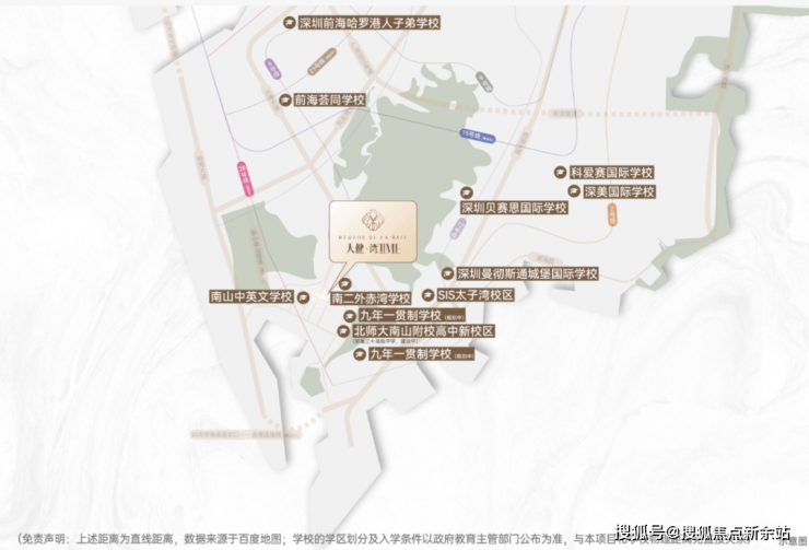 (免责声明:上述距离为直线距离,数据来源于百度地图;学校的学区划分及入学条件以政府教育主管部门公布为准,与本项目和学校物理距离无直接关系)