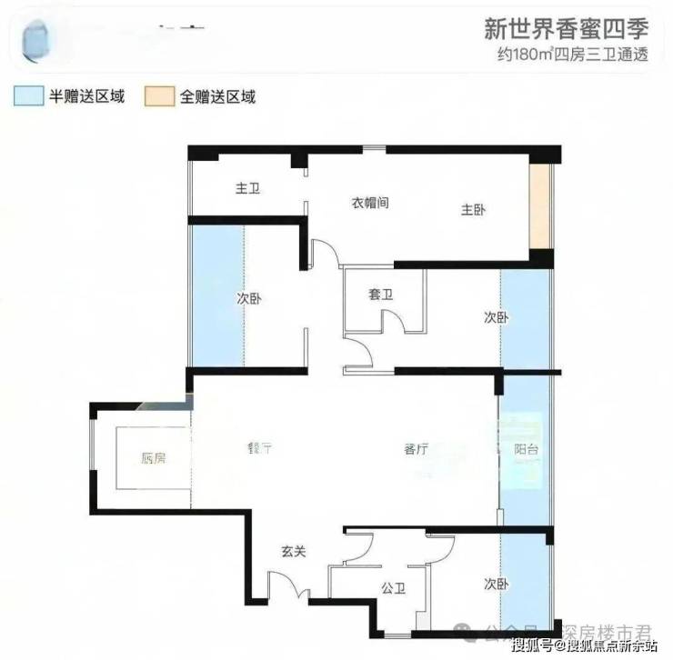 【建筑面积180㎡4房3卫】3梯3户设计,端户未能做到南北通透。朝向西南,使用率高。