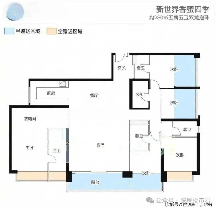 【建筑面积230㎡5房5卫】3梯3户,户型中有3个暗卫。朝向西南。