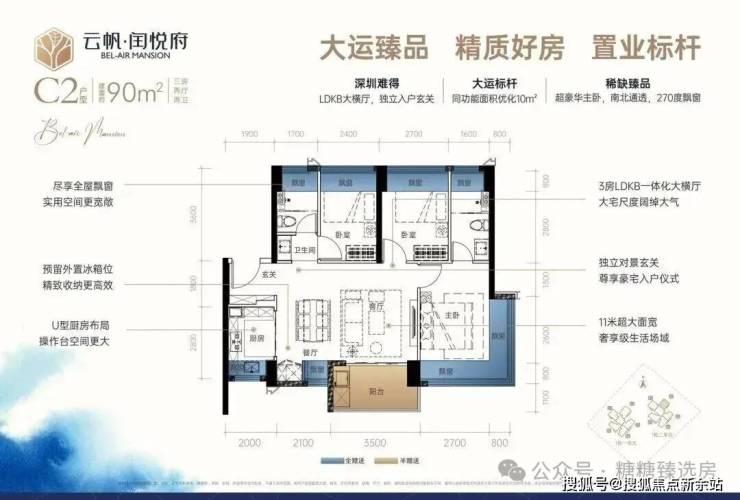 90㎡3房2厅2卫:设计的是经典横厅格局,LDKB一体化,进门入户玄关,客厅带3.5米阳台,U型厨房,主卧南北通透270度景观,卫生间干湿分离。