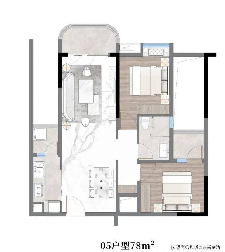 78㎡两房:创新"双动线玄关",通过移门系统实现书房与客餐厅的灵活转换,3.6米观景阳台配备智能遮阳系统