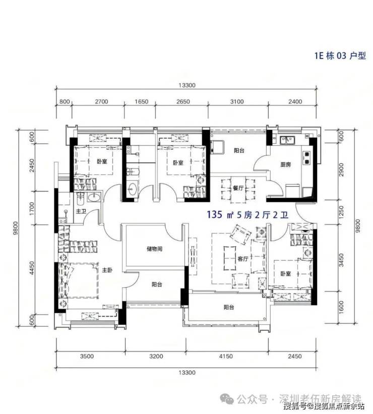 135m²5房2厅2卫,南北通户型,客厅开间4.2米,都有阳台改卧室以及餐厅改造,赠送后得房率在96%左右。