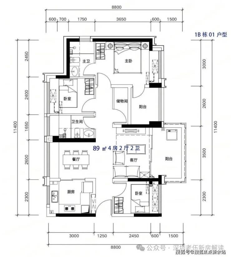 89m²4房2厅2卫,有竖厅和南北通户型,客厅开间3.5米,都有阳台改卧室以及增加客厅进深改造,赠送后得房率在93-96%左右。