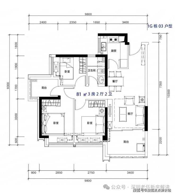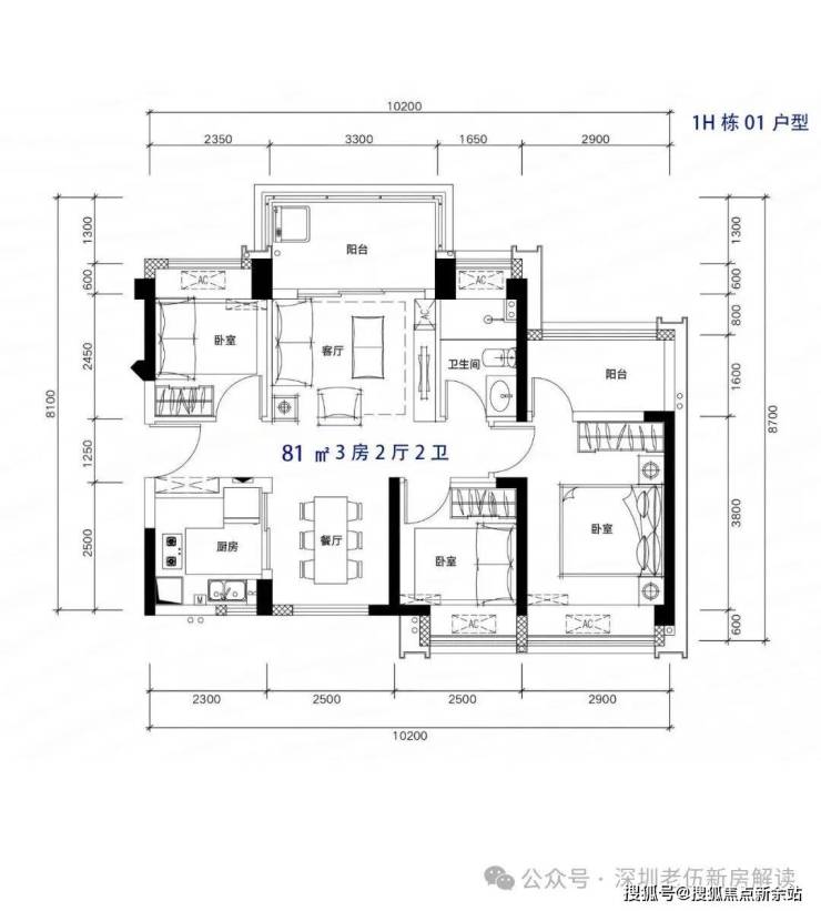 81-82m²3房2厅2卫,有竖厅和南北通户型,客厅开间3.3-3.4米,都有阳台改主卫以及增加客厅进深改造,赠送后得房率在92%左右。