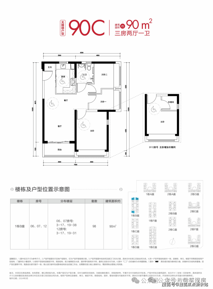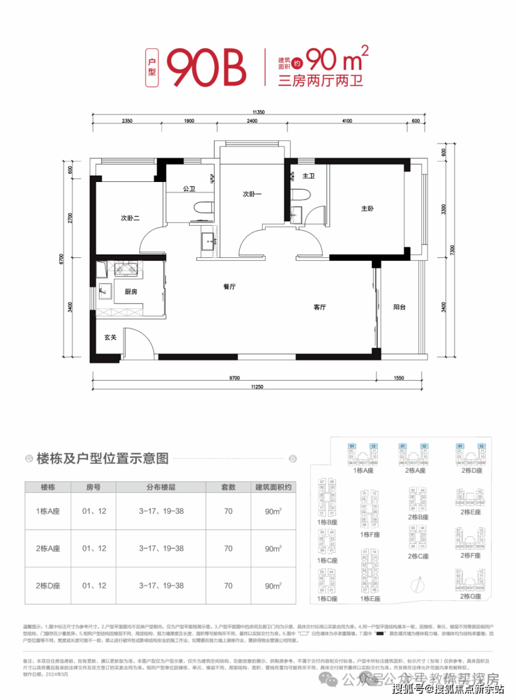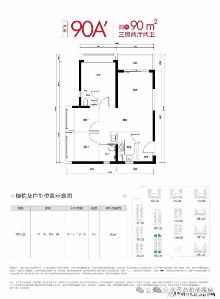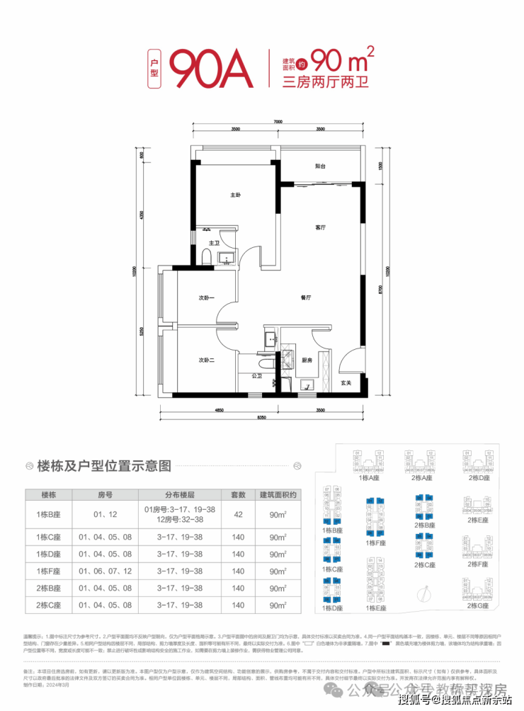 90㎡3房2卫户型也有3类,都为竖厅户型。