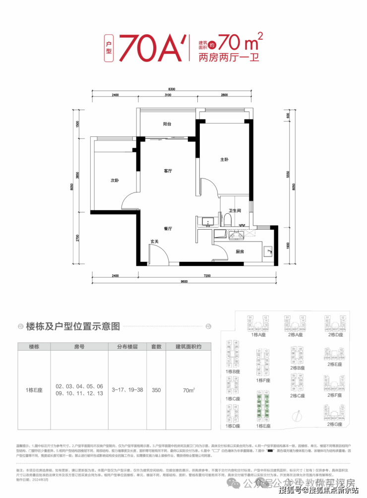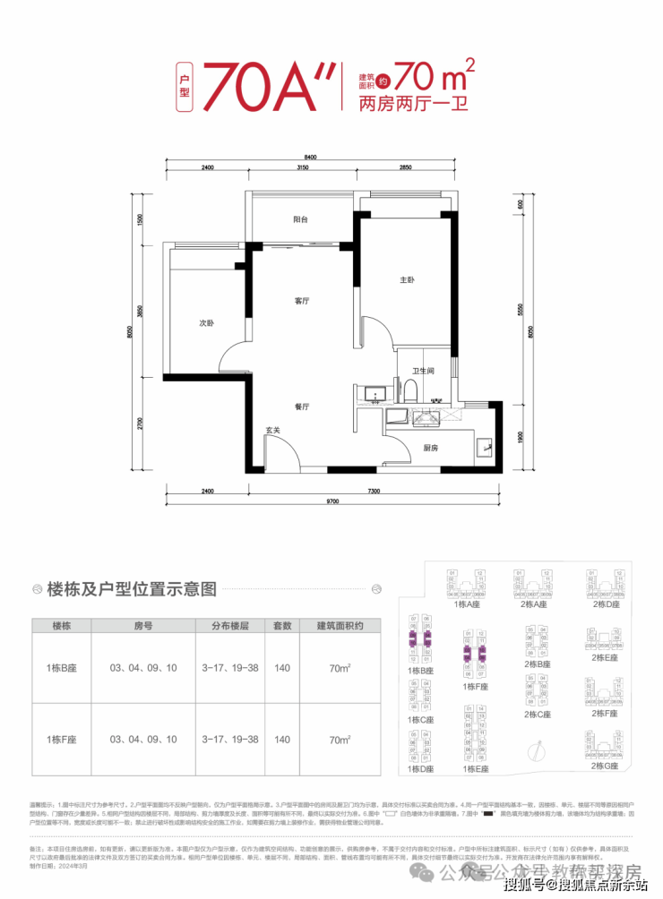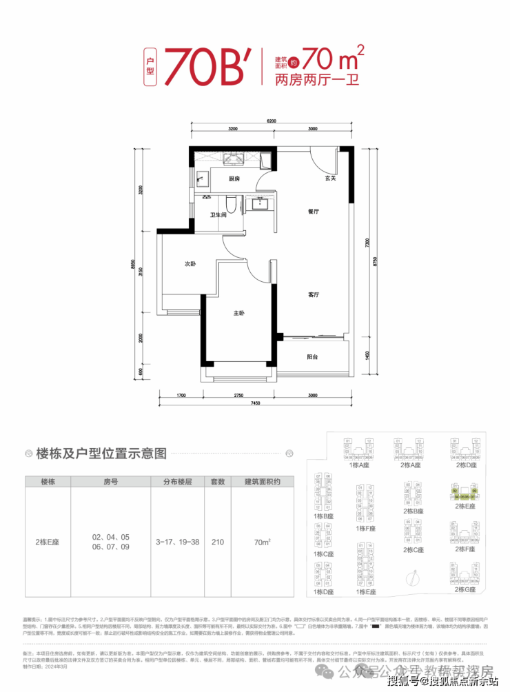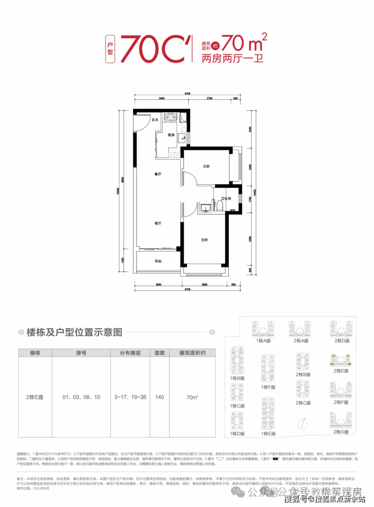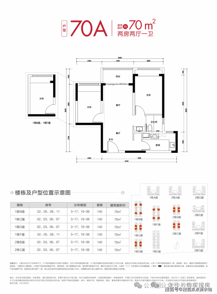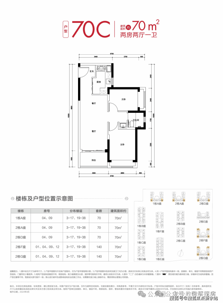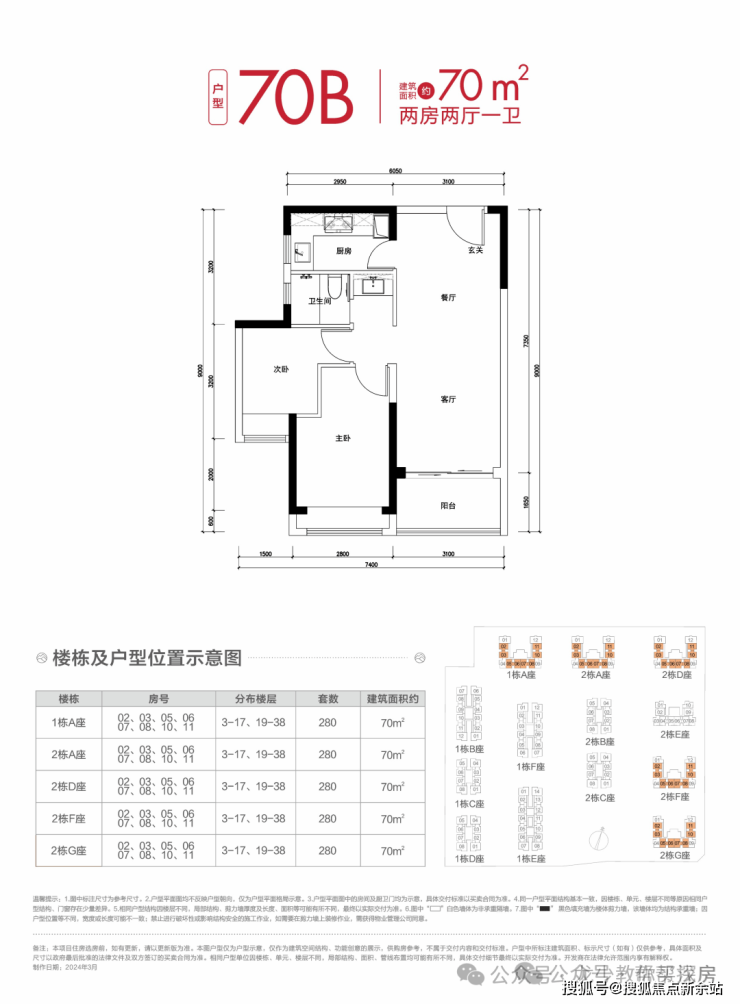 70㎡2房1卫户型有3类,有双龙抱珠、竖厅户型,选择多样。