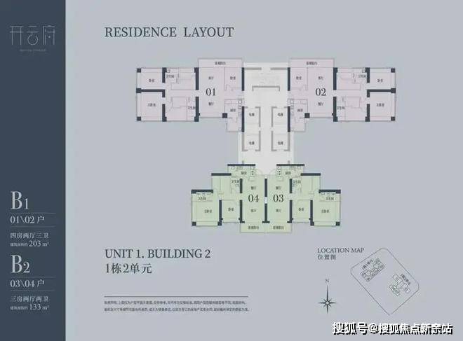 B2有两条腿,分别1-2栋03/04,主朝向西南向,竖厅设计。