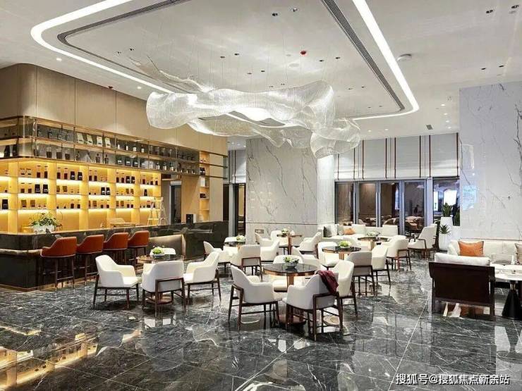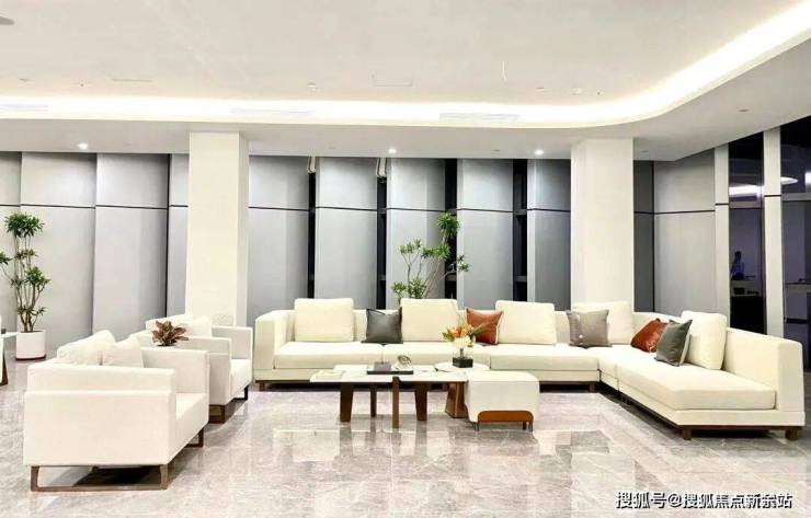 整个开放式洽谈区的光线明亮、空间宽敞而舒适,悬挂在半空的艺术灯饰,似羽毛轻盈,又如浪涛翻涌。一杯茗茶,落座其间,未来的理想企业人居生活在这里娓娓道来。