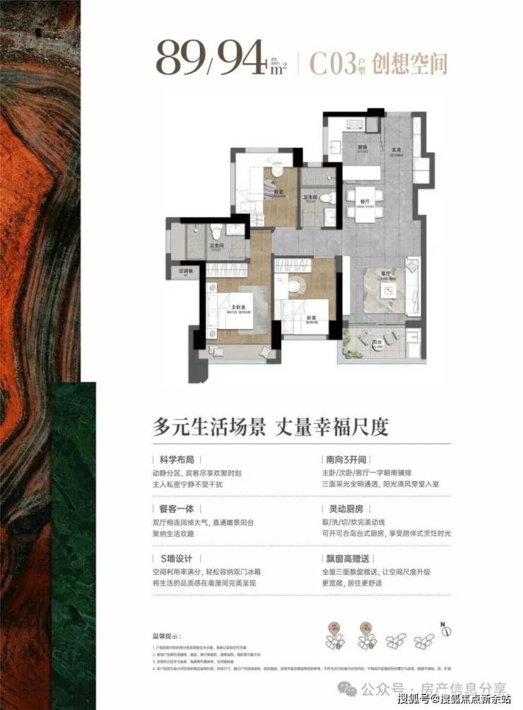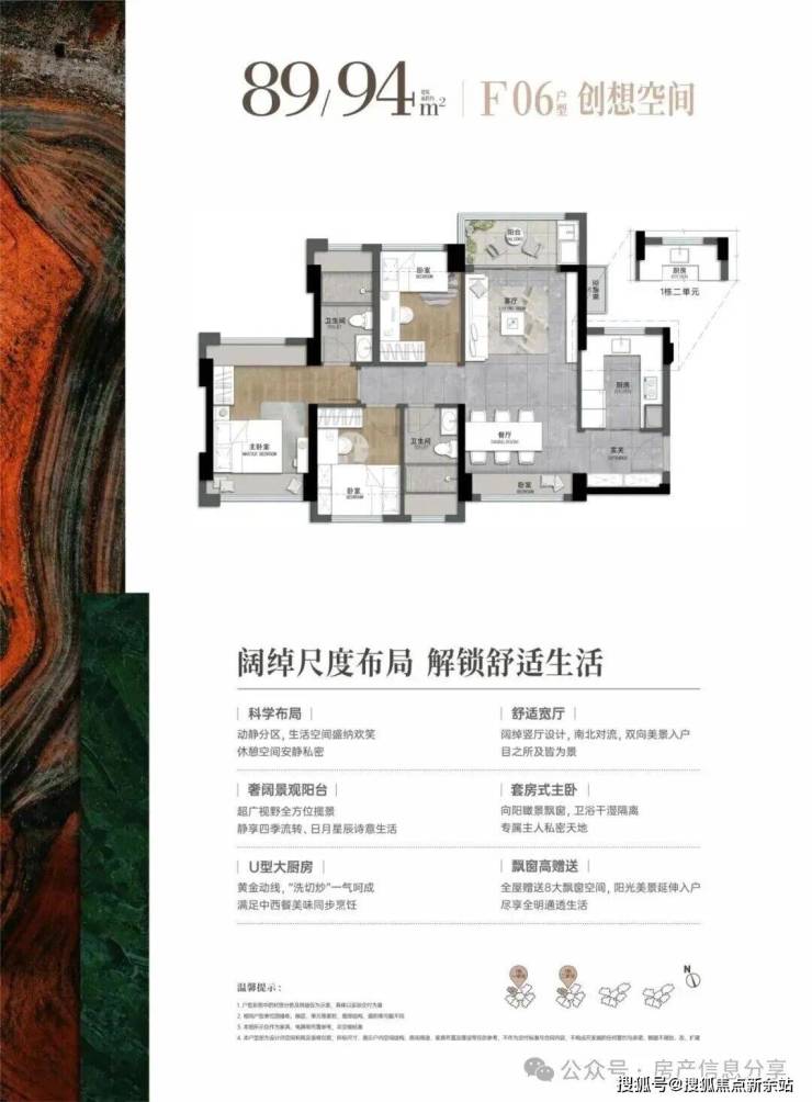89-94㎡的3房2厅2卫,06户型,设计的是横厅南北通透格局,进门入户玄关,客厅实测3.28米开间,LDB一体化设计,全屋8面飘窗,四开间朝南,主卧南北通套房,3个卧室分别做到了主卧13.65㎡/次卧7.61㎡/次卧7.31㎡(实测面积,不含墙体),U型厨房,卫生间干湿分离,得房率约76-81%(不含赠送),阳台主朝东北向。