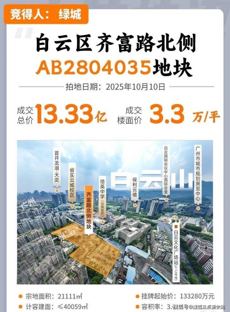 在2025年10月10日~绿城以总价13.33亿拿下齐富路北侧地块,名义楼面价3.3万/平,地块可建设用地面积1.3万平,总建面4万平,容积率3.0。
