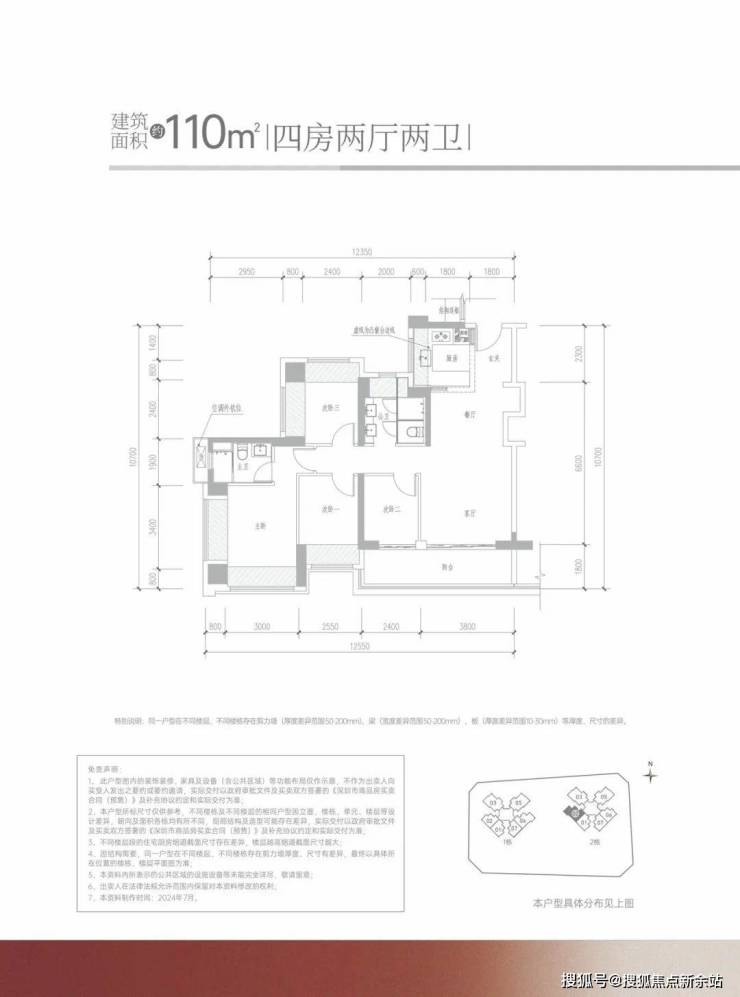 110㎡的4房2厅2卫,设计的是经典竖厅格局,客厅3.8米开间,进门独立玄关,LDKB一体化设计,S墙设计预留冰箱卡槽位,4个卧室分别做到了3.8米/3.2米/2.55米/2.44米的宽度,U型厨房,公卫三段式分离设计,得房率约:95%(包含赠送),客厅连接次卧出6.2米的大阳台,朝西南向。