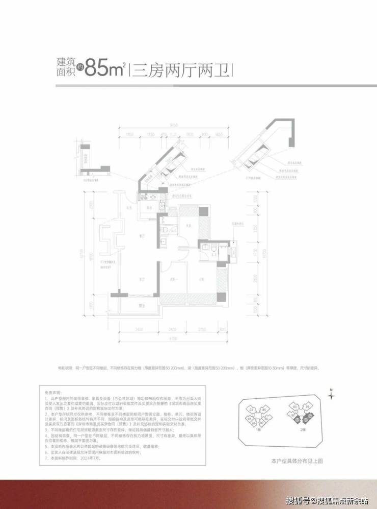 85㎡的3房2厅2卫,设计的经典竖厅格局,客厅3.4米开间,LDKB一体化设计,S墙设计预留冰箱卡槽位,3个卧室分别做到了3.55米/2.6米/2.4米的宽度,U型厨房,公卫三段式分离设计,得房率约:95%(包含赠送),阳台进深1.8米,有西南或东南朝向。