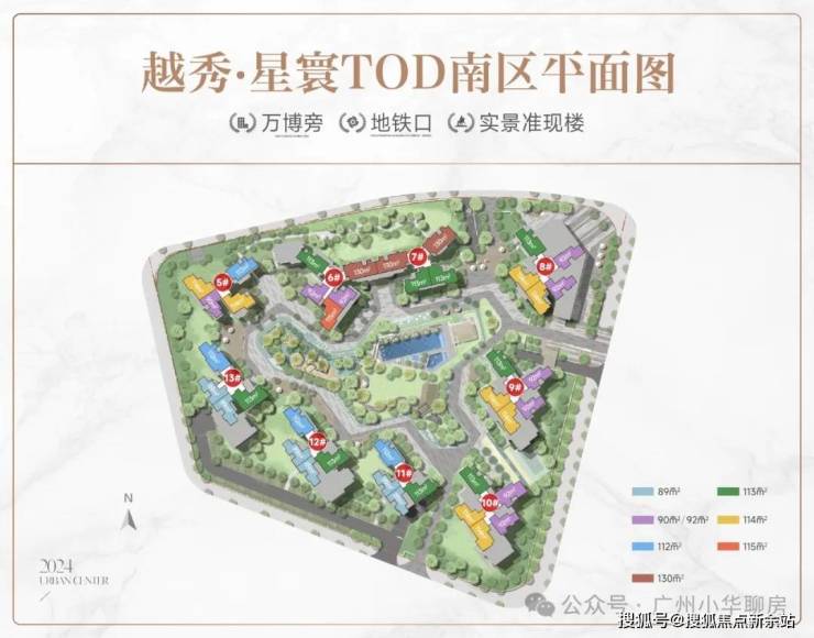 越秀星寰 TOD 雄踞广州番禺南站与万博双 CBD 核心,汉溪大道中轴之上,是国企越秀地产匠造的战略级 TOD 标杆,也是广州南部罕见的地铁口全南向现楼住区。项目总占地约 7.07 万㎡,总建面约 22.9 万㎡,容积率 3.0,绿化率 35%,规划 13 栋 17-30 层住宅,总户数 1306 户。建筑采用现代简约公建化立面,搭配高比例玻璃幕墙,围合式布局打造超百米楼间距,营造通透大气的城芯低密氛围。产品主打建面约 89-130㎡全南向三至四房,2 梯 4-5 户舒适梯户比,户户方正通透、实用率超 90%,层高约 3 米,中高楼层拥中央园林、南站 CBD 与广州足球公园三重景观视野,部分户型配 6.5 米宽景阳台与全景飘窗,以 “TOD 现楼” 的全能尺度,重新定义主城改善居住标准。