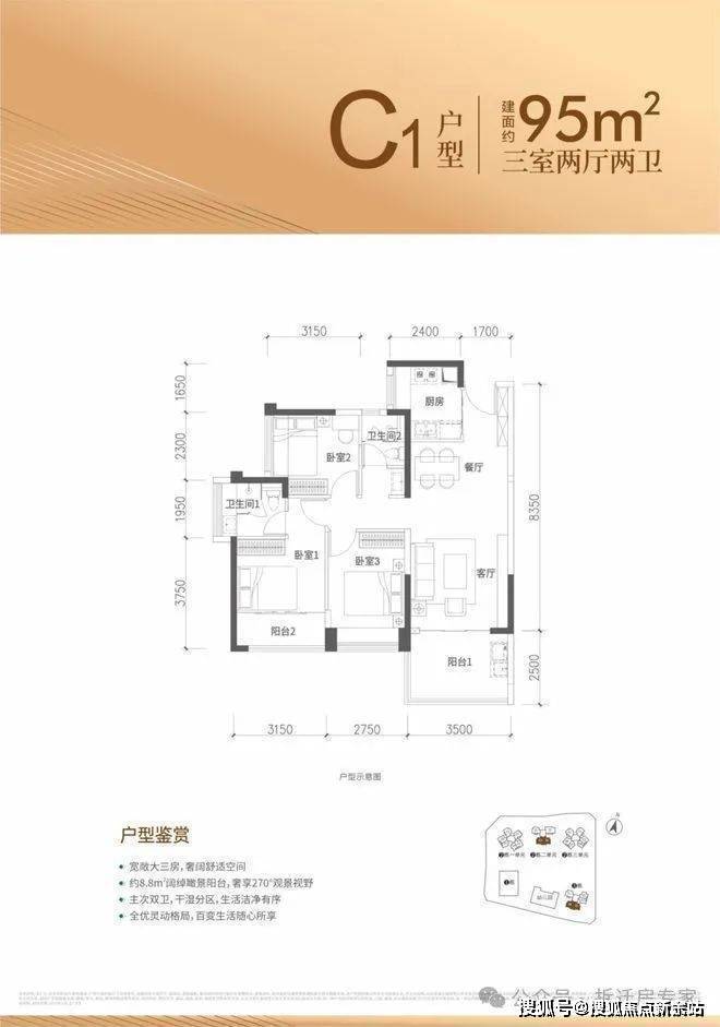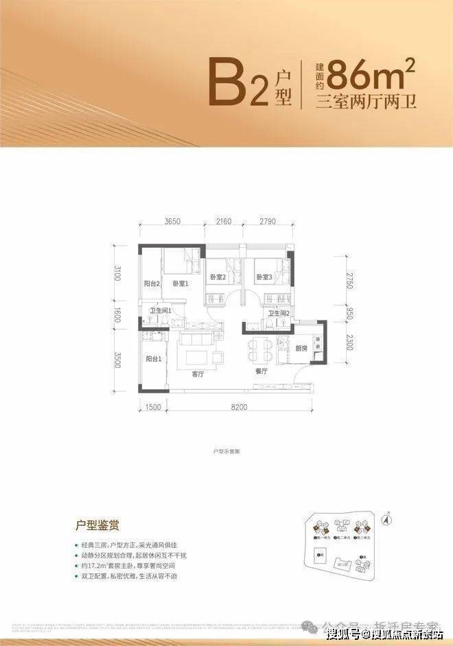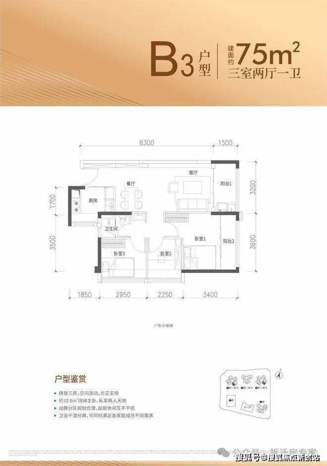 设计的是竖厅格局,客厅3.5米开间,进深8.2米,LDKB一体化设计,三开间朝南,3个卧室分别做到了主卧13.59㎡/次卧7.95㎡/次卧6.06㎡(实测面积,去掉墙体飘窗),U型厨房,公卫三段式分离,得房率约79%(不含赠送),东南或西南朝向。