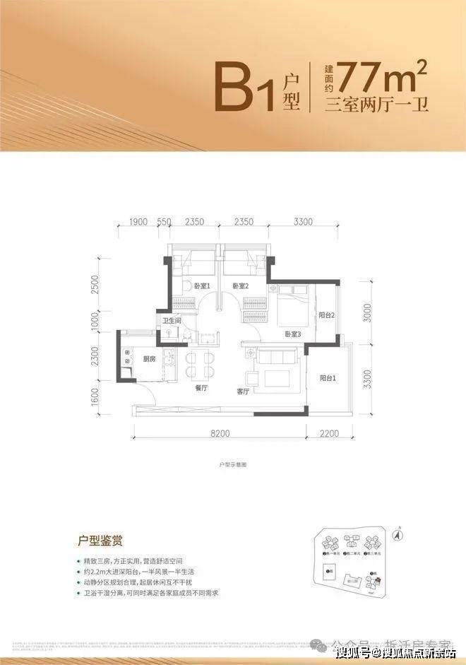 设计的是竖厅格局,客厅3.3米开间,进深8.2米,LDKB一体化设计,3个卧室分别做到了主卧11.3㎡/次卧7.28㎡/次卧7.28㎡(包含墙体飘窗),U型厨房,卫生间三段式分离,得房率约79%(不含赠送),东南朝向。