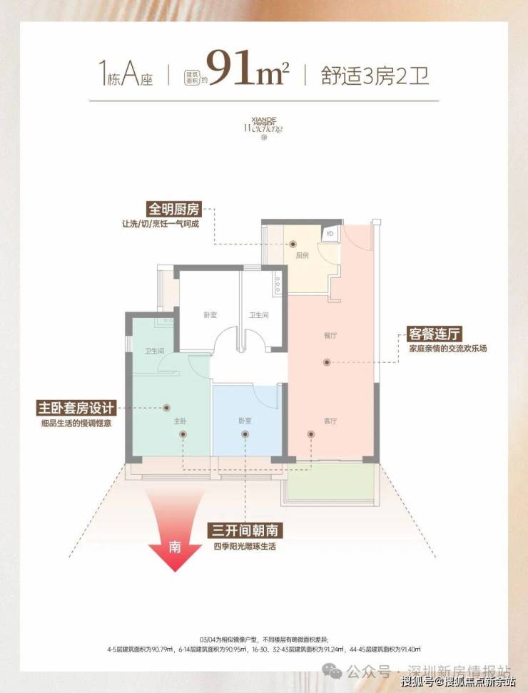91㎡ 3房2厅2卫 传统竖厅设计 3开间朝南,客餐厅南北对流,主卧套房设计。