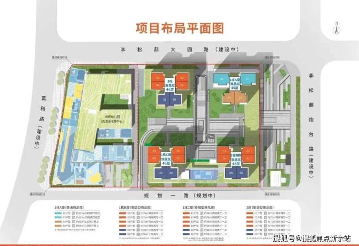 该项目共有住宅4栋,其中商品房1栋,三梯4户45层,安居房共有3栋,均为三梯6户46层。住宅共有896户,其中安居房736户(三房约246套,两房约490套),商品房160户。车位有920个,车位比超过1:1,比较充足。