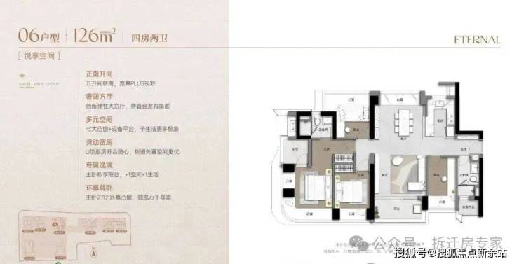 173m²的4房2厅3卫+家政间,设计的是竖厅类双龙抱珠格局,独立电梯厅入户约8.13㎡,客厅5.55米开间,LDKB一体化设计,主卧套房270°环幕凸窗+私享阳台,八大凸窗+设备平台+家政间,分别做到了主卧27.1㎡/次卧14.87㎡/次卧12.38㎡/次卧8.38㎡/家政间2.93㎡+阳台1.38㎡(实测面积,去掉墙体),U型厨房,公卫三段式干湿分离,得房率超90%(包含赠送),阳台9.56㎡正北朝向,看会展中心+市民广场。